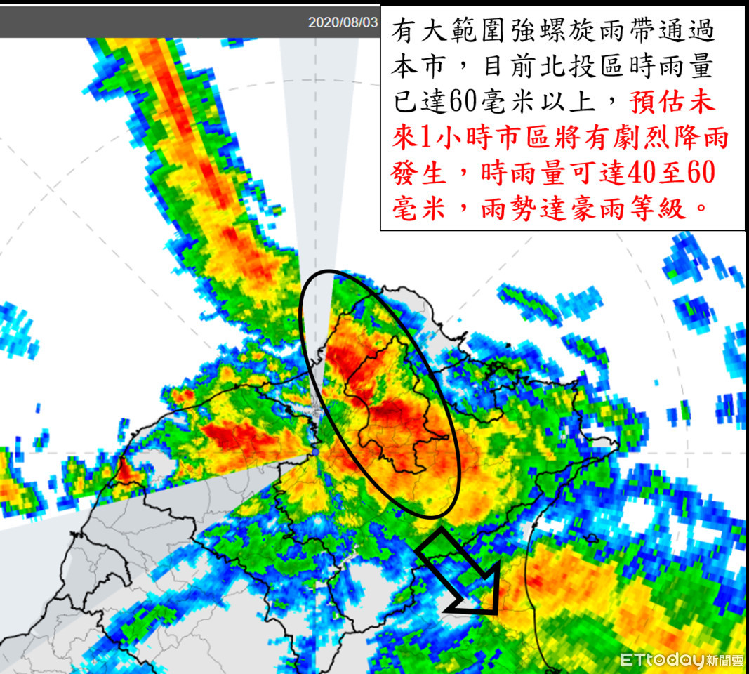 今年第4號輕度颱風哈格比(國際命名HAGUPIT)逼近台灣,北市府災害防救辦公室3日提醒,目前有大範圍的強螺旋雨帶通過北市,北投時雨量已達60毫米以上,預估未來1小時市區將有劇烈降雨發生,時雨量可達40-60毫米的豪雨等級。