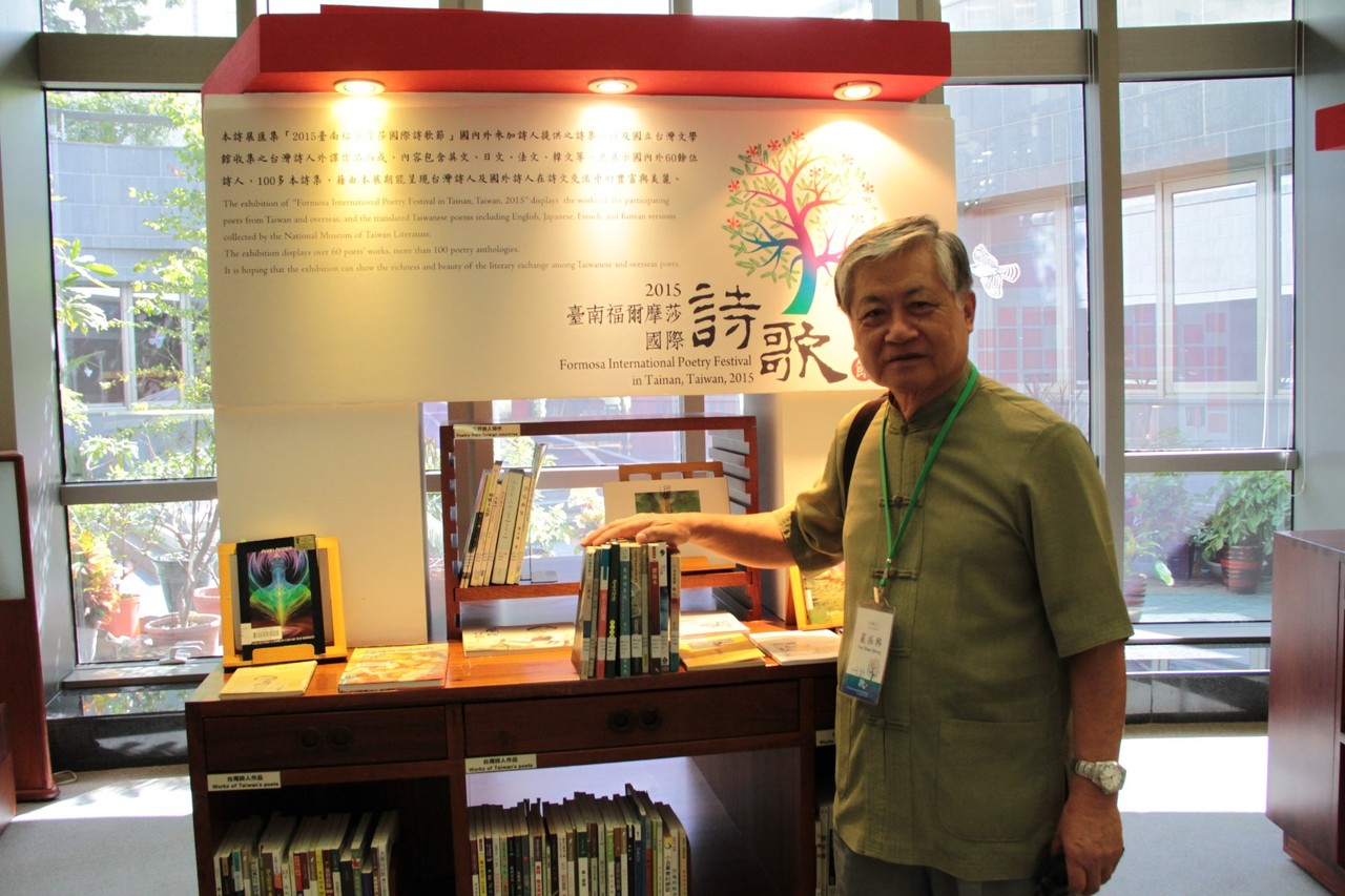 ▲八行詩創始詩人岩上過世。享壽82歲。此照片為2015台南福爾摩莎國際詩歌節書展,岩上與自己的著作合影。(圖/國立臺灣文學館提供)