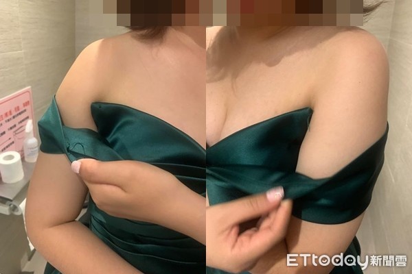 更離譜的是,兩件伴娘服的尺寸全錯,背後綁帶也是斷掉的,看上去非常不美觀,苦主說,「雖然他們承諾要當場幫我們從台北市送到新北市的宴客現場,但只剩10分鐘就要開始進場了,所以兩位伴娘只好穿著極度不合身的衣服(兩位伴娘身材差不多,但兩件衣服一件太大一件太小),協助整場婚禮。」