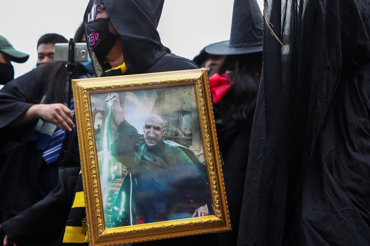 示威者打扮成著名奇幻小說《哈利波特》內的人物,手拿「魔杖」誓言要下咒「保護民主。」示威者更將泰王比做故事中的反派「佛地魔」,諷刺在泰國不能稱呼的泰王的名字,只能和故事中描寫的一樣稱呼他為「那個人」。