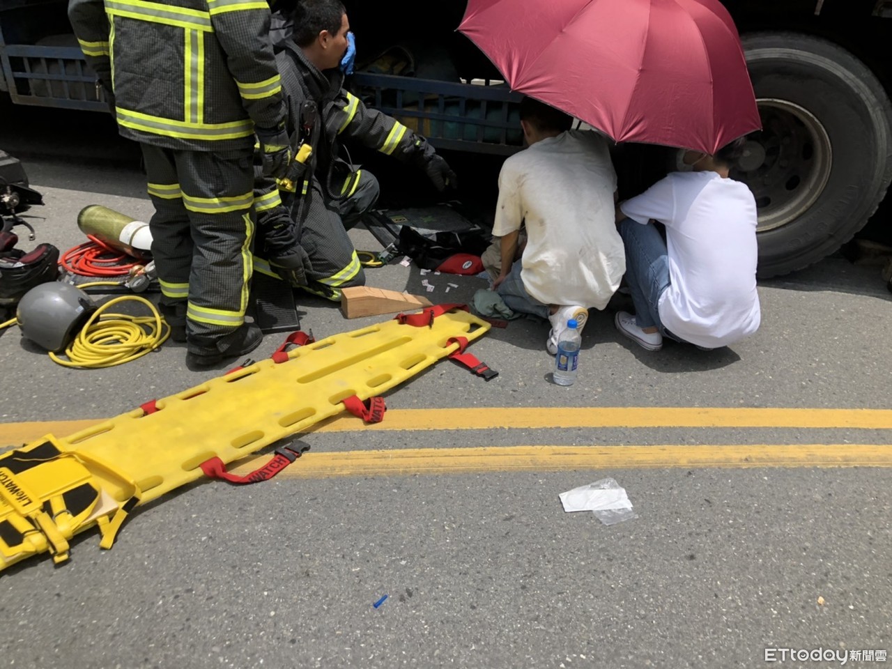 台東縣達仁鄉台9戊線3公里處6日上午11時許發生一起事故!一台大貨車與機車發生車禍,騎士不慎捲入車底,警消獲報後,趕緊前往現場救援,所幸傷者被救出後,仍有意識,目前已送往枋寮醫院救治,至於事故發生原因,仍有待警方釐清。