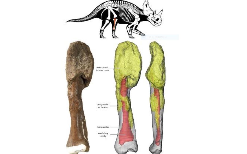1989年,考古隊在加拿大阿爾伯塔省的不毛之地挖掘出土了一根嚴重畸形的尖角龍(Centrosaurus )腿骨,古生物學家最初認為這是恐龍骨折癒合後所造成的。然而,後來科學家在顯微鏡下利用治療人類癌症的技術再次進行研究,確定腿骨呈現的「畸形」,實際上是一種惡性腫瘤。