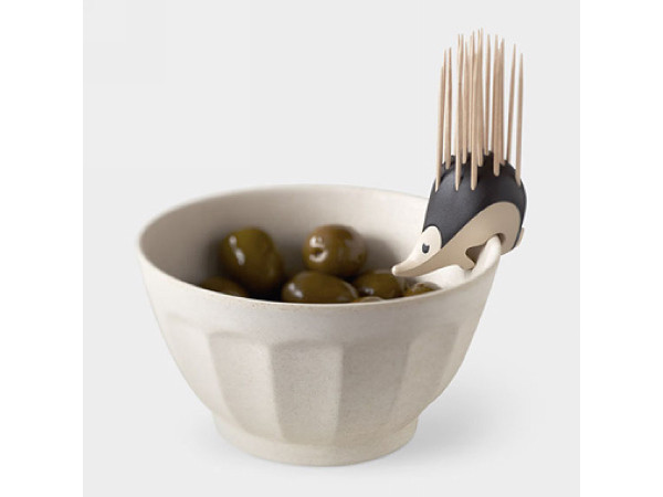 設計師的巧思不只是把牙籤放到刺蝟身上,還利用底部的彎曲,讓這隻刺蝟可以巧妙地固定在碗盤邊,如此一來,不但讓取用牙籤變的衛生方便,也間接地營造出一幅可愛逗趣的景象。其實這個設計品一開始的發想並不是從吃水果而來,而是外國人常吃的橄欖,但小巧可愛的造型,就算只是放在桌上供人使用牙籤,也令人心動不已!誰說刺蝟一定帶刺,背負牙籤的刺蝟,我們更愛!