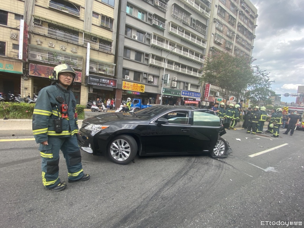 ▲一台LEXUS轎車遭煞車失靈的公車撞上,所幸車上2人輕傷,公車上6人均無大礙。(圖/記者邱中岳翻攝)