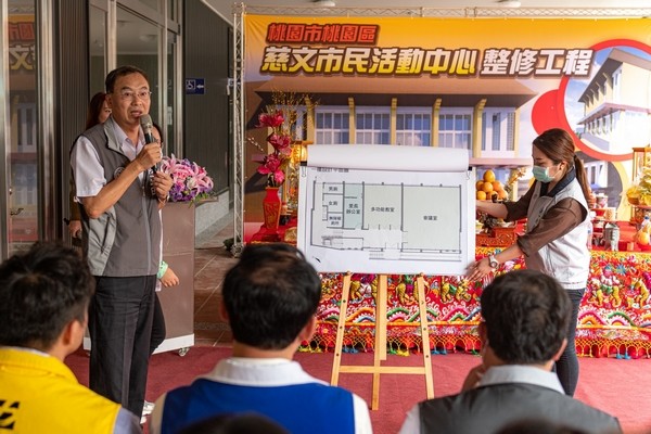 為了讓公幼與私幼比例到達教育部規定的四比六,桃園市政府推動學校型公幼或大型幼兒園取代社區型分班,並將原有空間加以活化,桃園區公所11日進行「慈文市民活動中心整修工程」祈福典禮,預計於今年11月完工後,將提供市民更為舒適的集會場所,也讓年輕家庭能夠走入活動中心。