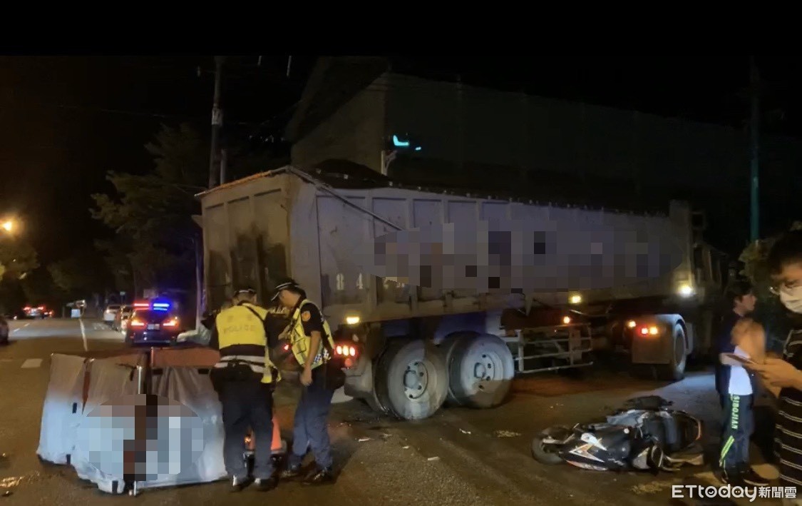 ▲11日晚,宜蘭蘇澳新站前,左轉大貨車與直行雙載機車相撞,釀一死一傷悲劇。(圖/記者游芳男翻攝,下同)