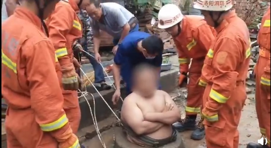 河南洛陽市一名體重125公斤的男子近來卡在一口井中,只見上身赤裸的他整個人緊緊卡在井口、完全動彈不得,消防人員抵達現場後,使用繩子纏繞他的身體一圈,費了好大一番功夫才終於拉出,至於他墜井的原因則讓眾人感到好氣又好笑。