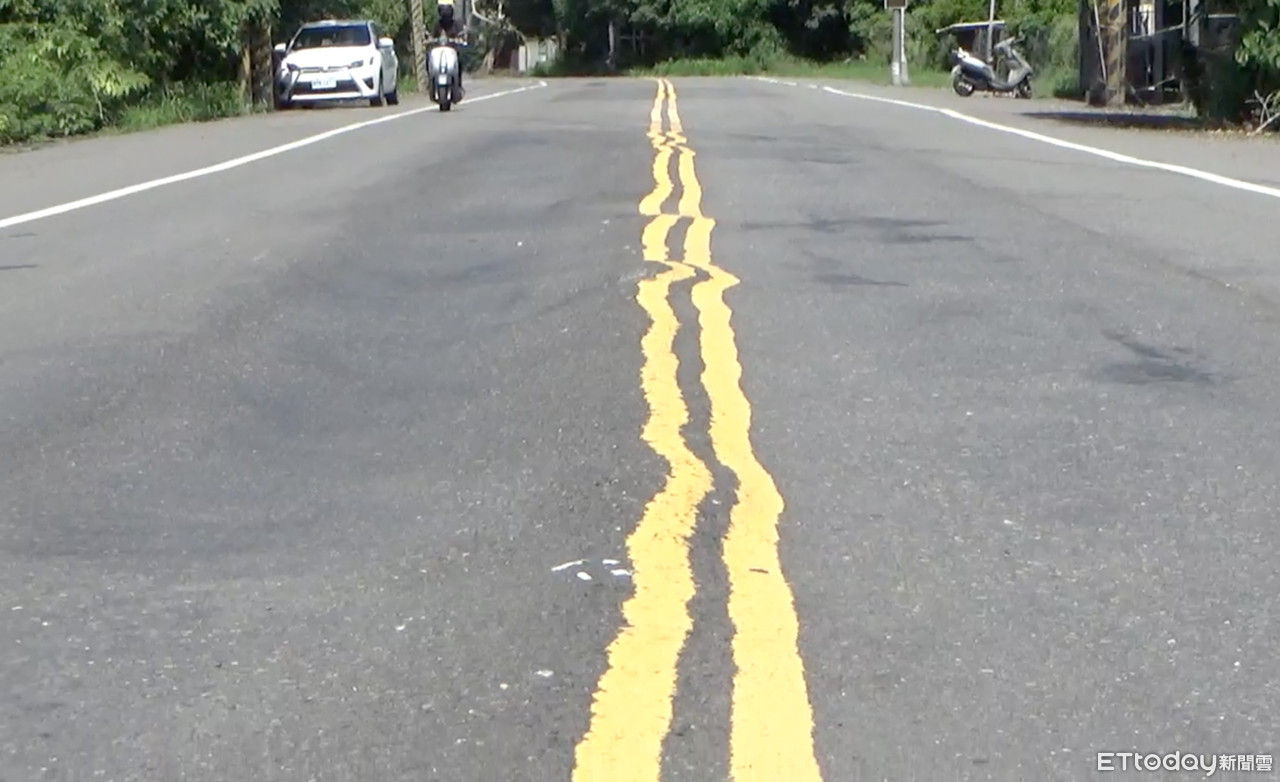 ▲光復東路從中山高車道下方一直到銜接145縣道路段約300公尺中,有三處疑似路基掏空般,路面嚴重凹凸更導致所劃設之雙黃線扭曲變形。(圖/記者蔡佩旻攝)
