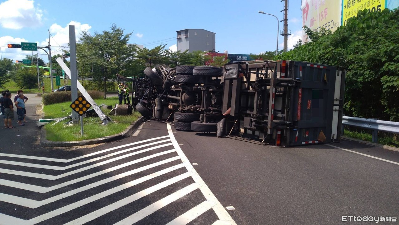 ▲國道二號大湳匝道口貨車翻覆。(圖/記者陳豐德翻攝)
