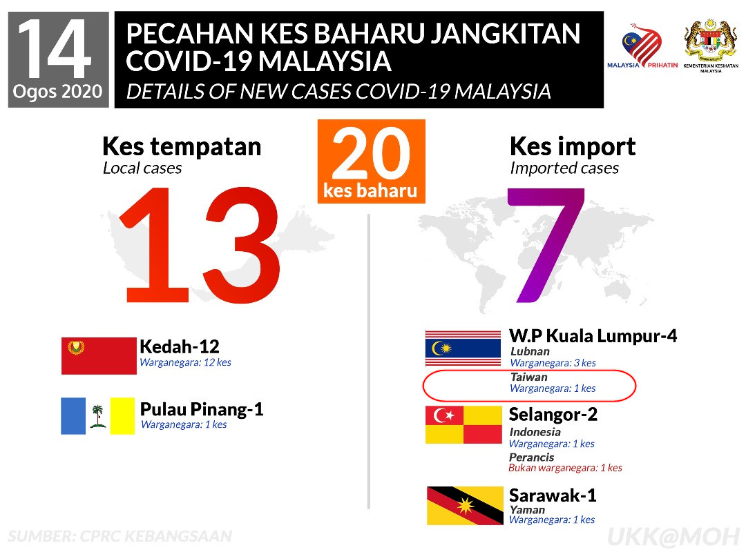 馬來西亞衛生部表示,14日新增20名確診病例,其中13人為本土感染案例、7人為境外移入案例。境外移入包含1名台灣、1名葉門、1名法國、1名印尼、3名黎巴嫩。