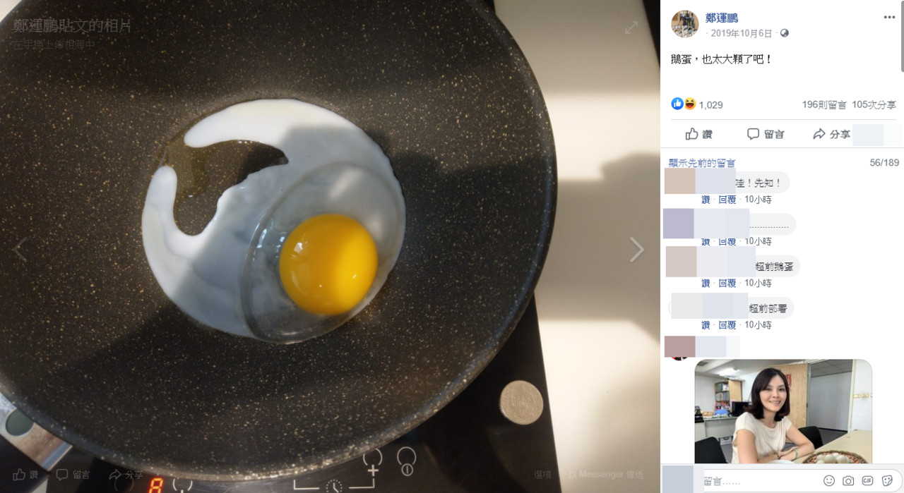 韓國瑜與李眉蓁在選前之夜這段「鵝蛋助孕」的談話,在網路上立刻引起網友熱烈討論。有網友挖出有生兒子的鄭運鵬去年在臉書的一張煎鵝蛋的照片,當時鄭運鵬寫道「鵝蛋,也太大顆了吧!」