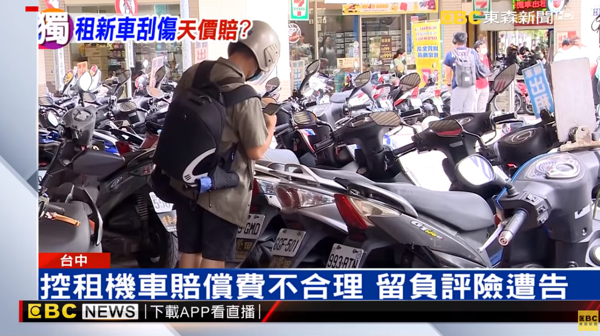 據東森新聞報導,正值暑假期間,一名大二男學生到台中租機車,結果停在彩虹眷村附近停車格內,回來後,竟發現整台車被撞倒,車體外觀被刮傷,無奈四周沒有監視器,抓不到兇手,車行老闆要求「照新車價」賠償1萬6000元。
