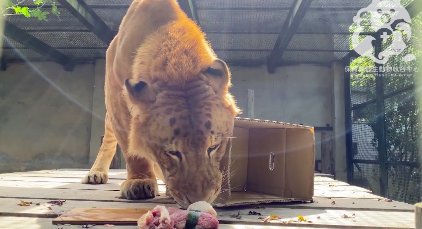 可愛的小阿彪今年滿10歲囉!屏東科技大學保育類野生動物收容中心內的獅虎的爸爸是非洲獅、媽媽是孟加拉虎,因為異種交配結果導致基因缺陷,讓「阿彪」得受苦終生,尤其牠「瘸腿佝僂」如一隻病懨懨的大貓令人看了很不捨。收容所在牠8月15日生日當天準備兩大驚喜,替阿彪慶生,影片曝光可以看到牠開心津津有味吃著大餐,可愛極了。