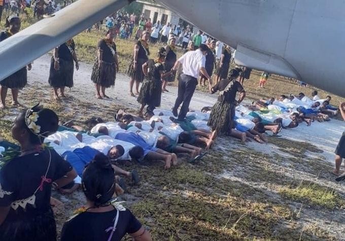 ▲新任中國駐吉里巴斯大使唐松根接受吉里巴斯迎接,走在孩童俯臥的「人體地毯」上,相關照片引發軒然大波。(翻攝自Michael Field推特)
