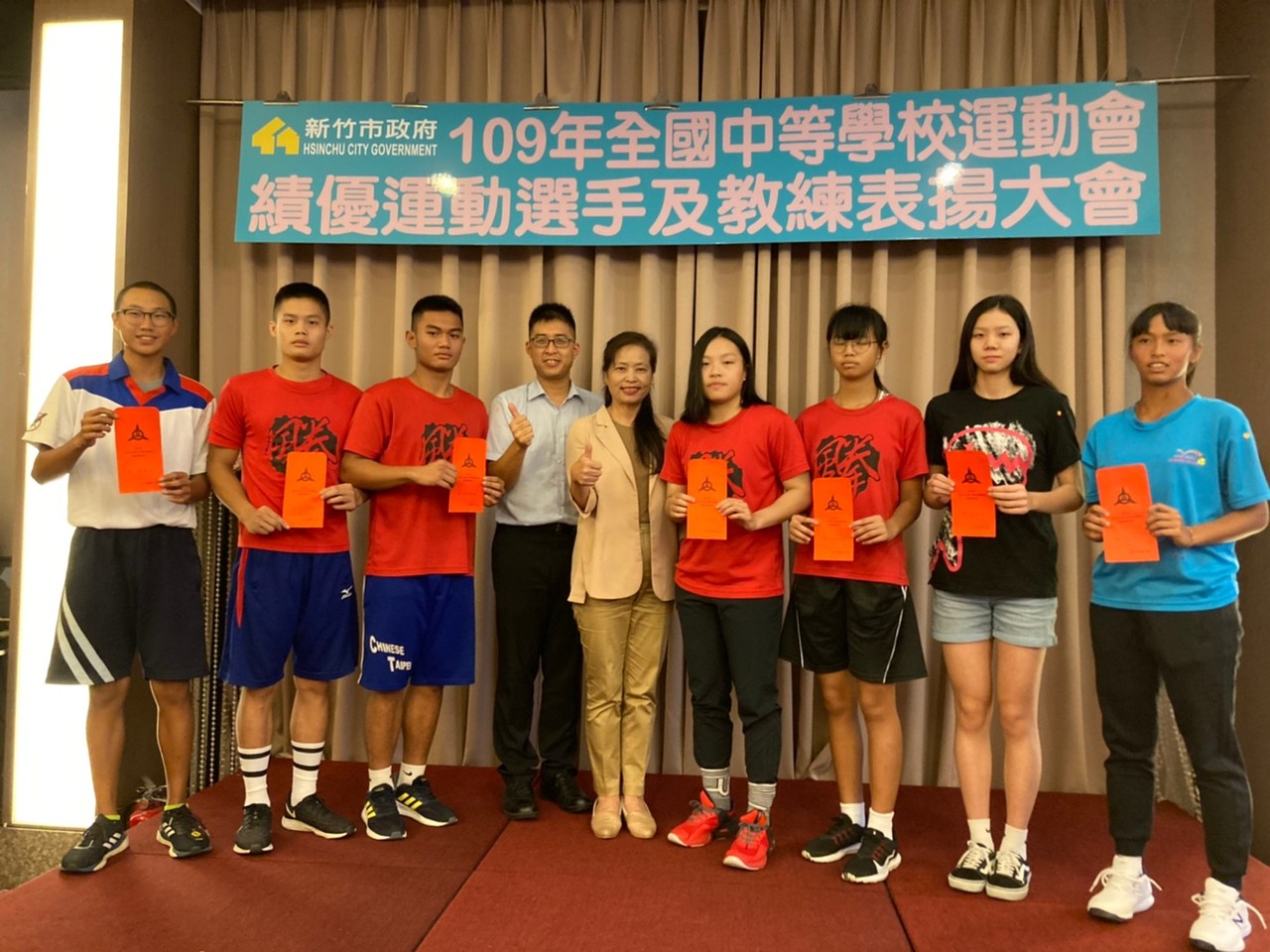 109年全中運新竹市代表隊榮獲11金10銀13銅的佳績,為表揚優秀的選手與教練,新竹市政府特別於舉辦「109年全國中等學校運動會表揚大會」,並由新竹市副市長沈慧虹親自為選手頒發獎勵金,以鼓勵各績優選手及勞苦功高的金牌教練。