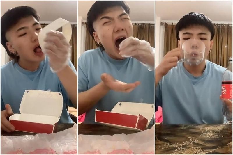 有中國吃播主在微博放上「無實物吃播」的影片,影片中只見他一手戴著塑膠手套,明明只看見空的速食店紙盒,他卻能大口咬下隱形的漢堡、還加上醬料,吃得津津有味。