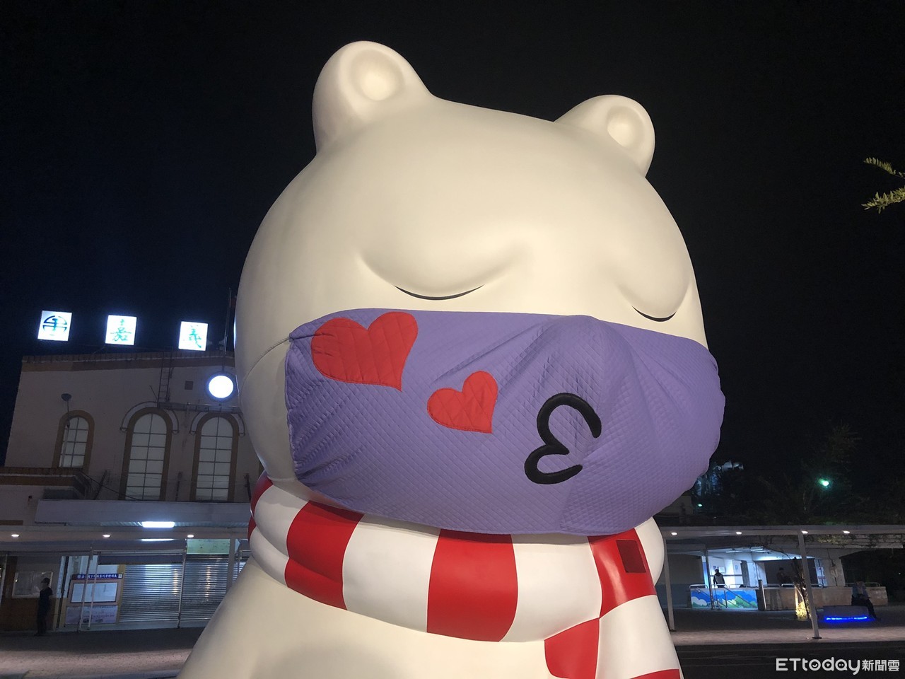 ▲嘉義火車站前沉睡大白熊變身換搭情人節裝扮,戴上超萌「啾咪口罩」。(圖/記者翁伊森翻攝)