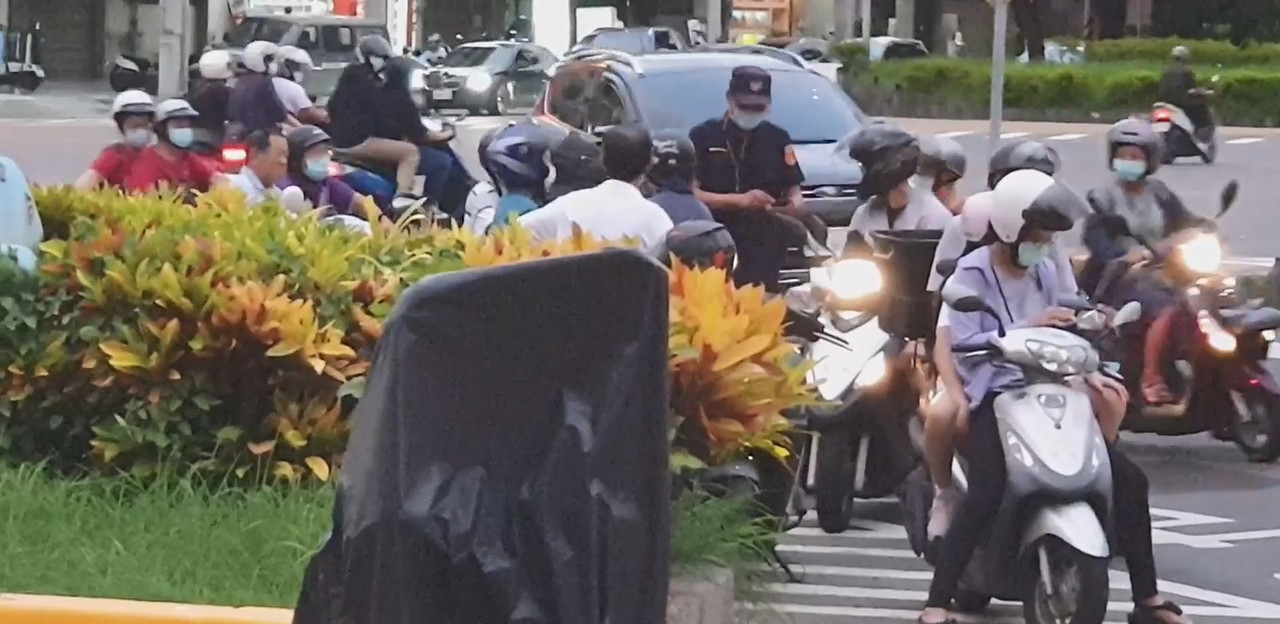 根據影片,許多騎士從海安路三段跟著汽車一起左轉到臨安路二段,當場被員警攔下來,至少有8輛機車,一群人圍著一名員警理論,後來有人陸續趁亂騎走。