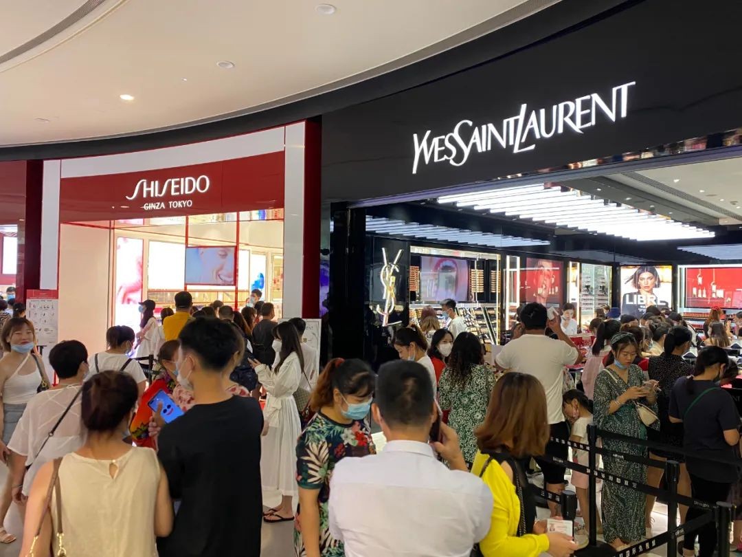 陸媒《澎湃新聞》記者走訪海南三亞海棠灣的三亞國際免稅城,發現上午10時30分左右,兩幢樓內都已陸續湧入人潮,B區的鐘錶、珠寶、精品區,Tiffany、寶格麗(Bvlgari)、普拉達(Prada)等熱門品牌門前已開始排隊;而在A區的國際精品、美容及個人護理區,更是人聲鼎沸。