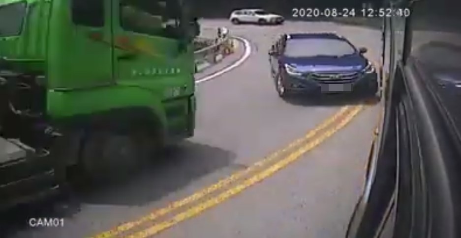影片一開始,一輛藍色轎車原本好好跟在一輛大車後方,大約35秒之後進入一處彎道,駕駛認為超車的時機到了,於是油門一踩、跨過雙黃線,加速切入對向車道,結果6秒之後又立即想切回原車道;原來對向車道正好有一輛砂石車駛來,幸好雙方車速並沒有太快,只是發生一點小擦撞。