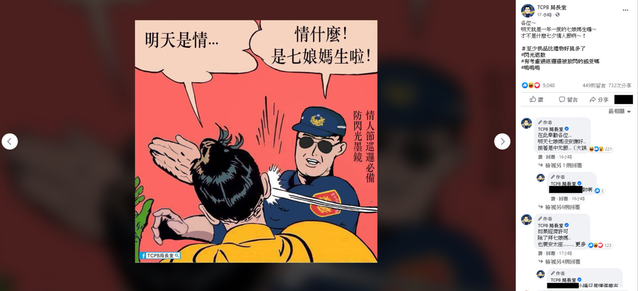 台中市警察局的粉絲專頁TCPB局長室小編為了慶祝情人節,昨天PO出一張圖片,圖中一名男子要說出「明天是情......」時,被警察當場呼巴掌,還說「情什麼」、「是七娘媽生啦」,圖右還寫著情人節巡邏必備防閃光墨鏡。