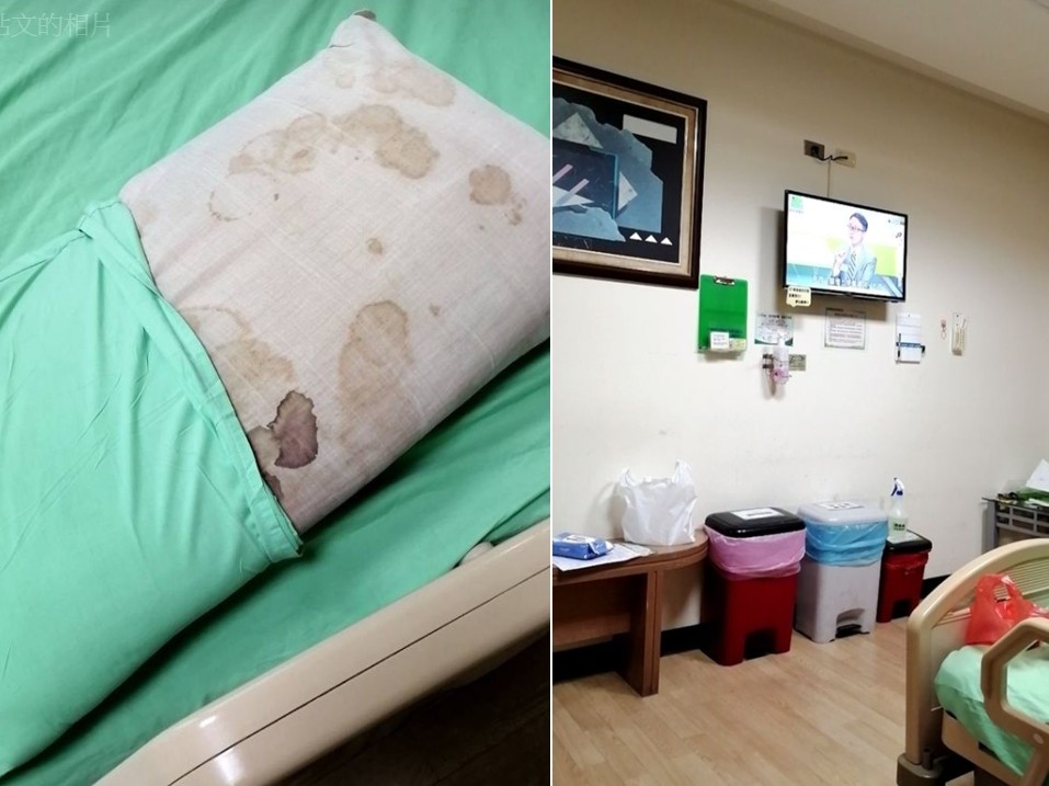 原PO在臉書社團「爆怨公社」貼出照片,她把枕套拉到一半才發現,枕芯不只泛黃發黑,上頭還充滿深淺不一的血漬,不知道先前有多少病人的血留在上面,要不是今天兒子打翻飲料把枕頭用濕,她根本不會發現枕頭這麼髒,「我想到我兒子跟血漬睡那麼多天…」。