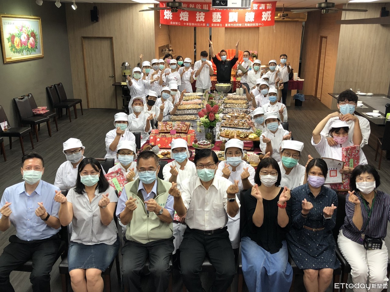 ▲中華醫大失業者職業訓練烘焙技藝訓練班的學員歡喜結訓,台南市勞工局長王鑫基、中華醫大校長曾信超(前排左三、左四)為學員祝福與勉勵,學員展示所學成果。(圖/記者林悅翻攝,下同)