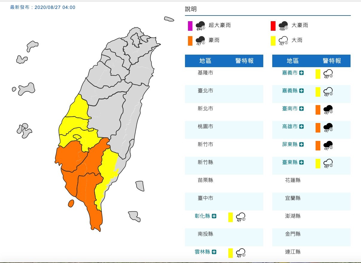 西南風增強影響,易有短時強降雨,氣象局在27清晨4點針對台南市、高雄市及屏東縣發佈豪雨特報;彰化以南至嘉義地區及臺東山區有局部大雨發生的機率,請注意雷擊、強陣風及溪水暴漲,低窪地區請慎防淹水。