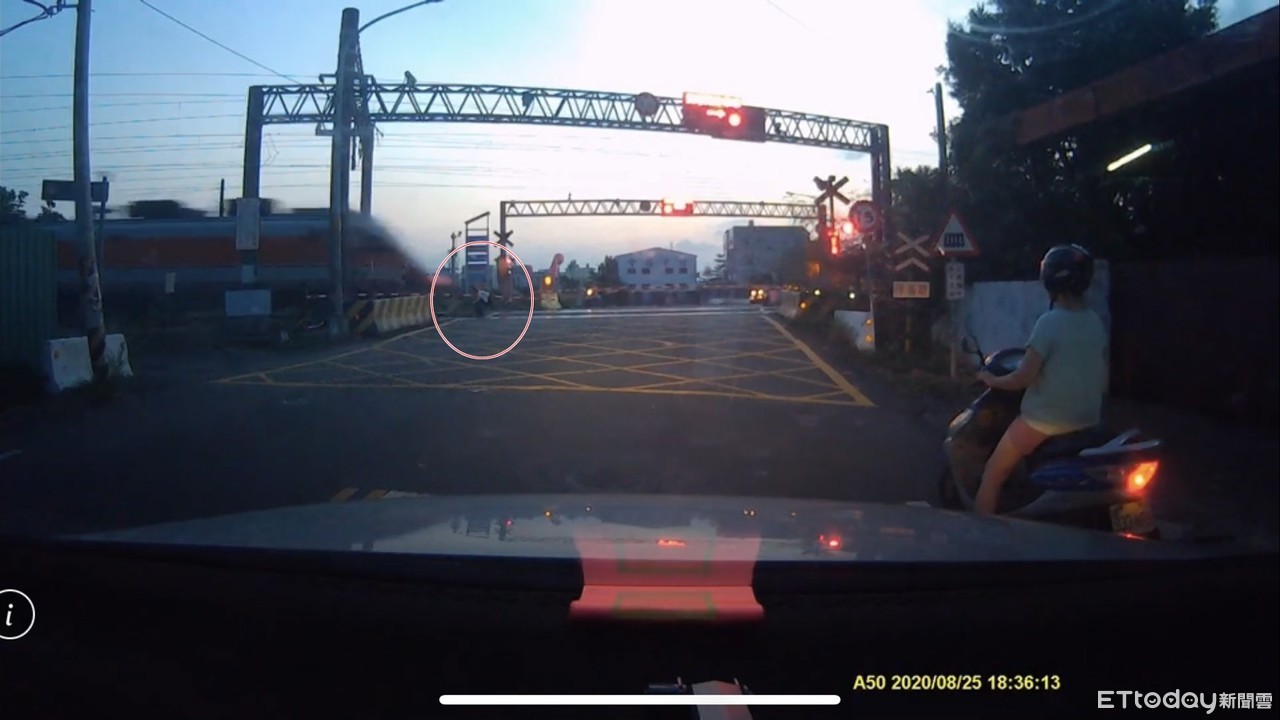 行車紀錄器畫面拍下,當時平交道警笛已經響起,柵欄也緩緩放下,路口汽機車紛紛停下等待列車通過,而一名身穿短裙、腳踩高跟鞋的女子似乎聽不見刺耳的警笛聲,逕自穿過柵欄、慢悠悠地蹲在鐵道上,疑似作勢尋短。鄰近駕駛目睹這驚恐一幕嚇得不能自已,急忙長按喇叭示警,要女子盡快離開平交道;而坐在副駕駛座的女子沒想到自己竟會目睹如此衝擊畫面,預想下一秒列車就要撞上,嚇得驚叫連連。