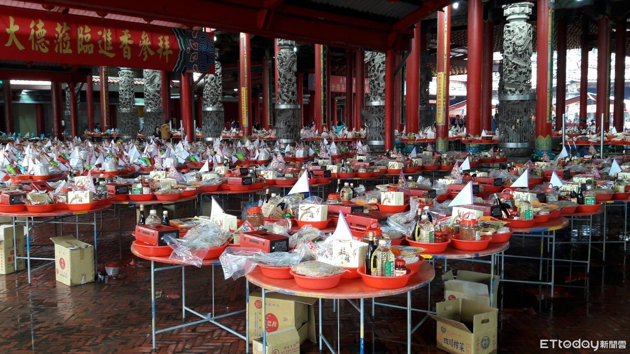 ▲台灣王爺總廟」南鯤鯓代天府大普度,雖然下大雨,虔誠信眾仍然準備琳瑯滿目祭拜供品參拜,場面盛況熱鬧。(圖/記者林悅翻攝,下同)