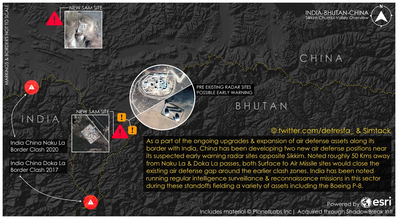 據印度斯坦時報(Hindustan Times)報導,情報分析人員在推特(@detresfa)發文表示,中國人民解放軍於中印邊界地帶開發「陸地對空中的防禦基地」,同時也分享衛星圖來分析,其中此防禦陣地覆蓋地區包括6月中中印衝突地點。