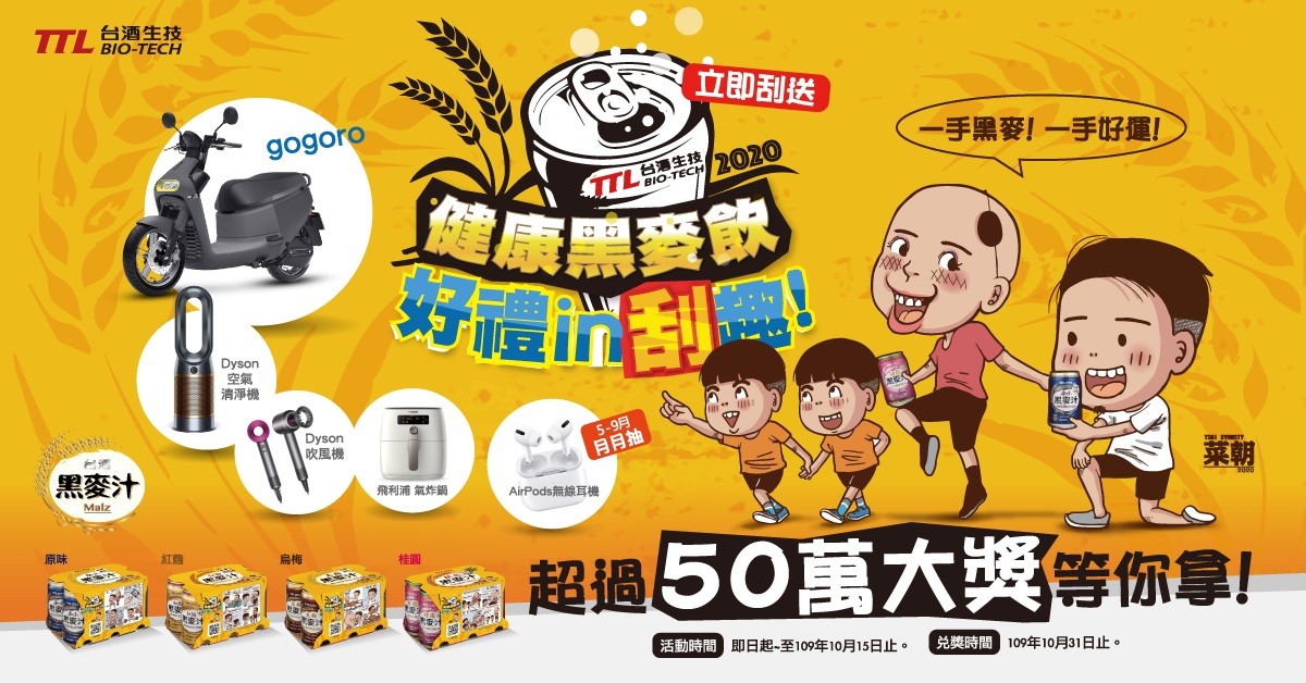 即日起至10/15止,凡於活動期間內購買印有「健康黑麥飲,好禮in刮趣!」台酒生技黑麥汁6入裝商品,即可參加紙盒刮刮樂活動,獎品豐富多元,包括Gogoro機車、Dyson家電等大獎;另於官方網站登錄購買6入產品系列發票(5~9月),即可參加加碼活動「月月抽送 AirPods Pro 無線耳機」,登錄越多,中獎機率越高,月月抽活動至9/30止。台酒自有通路、台酒購物網、全聯、家樂福、大潤發、愛買、PChome皆有販售。