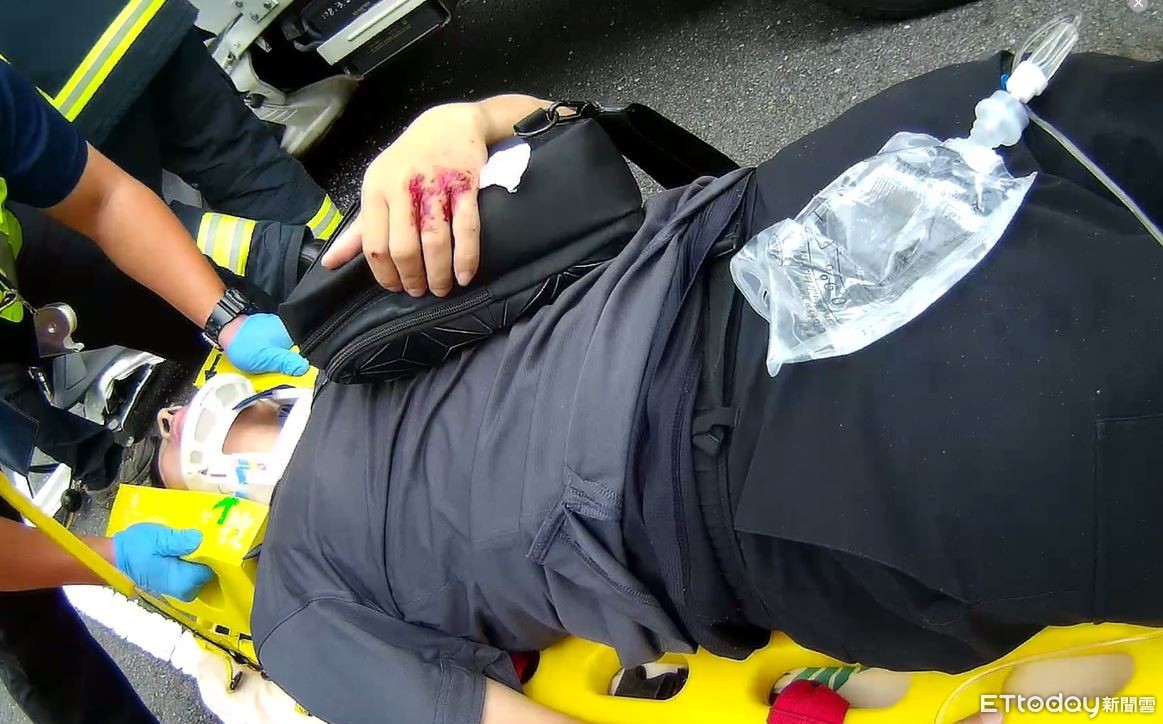 但陳姓傷者右腳踝被該車輛油門夾困且無法自行移動,需破壞器材進行救援作業,因此評估傷者生命徵象後,確定意識尚清楚,只是需較長脫困時間,救護人員立即為傷者進行靜脈注射及頸圈固定、清洗傷口及包紮止血等急救處置維持其生命徵象,隨即進行二度評估,僅發現傷者肢體有多處擦傷且右腳踝夾困外,待救助作業完成脫困後,立即利用長背板固定並後送至聖馬爾定醫院續作診治,現場車禍肇事原因,交由警方處理中。