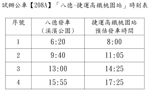 桃園市政府交通局指出,為增加服務八德擴大都市重劃區、大湳地區、內壢地區及高鐵站區等地區民眾與學生的就醫、就學、工作等交通需求,桃園市31日起新增208A「八德–捷運高鐵桃園站」市區客運路線,由統聯客運試辦營運,為3個月迄11月30日止,歡迎市民朋友多多利用。