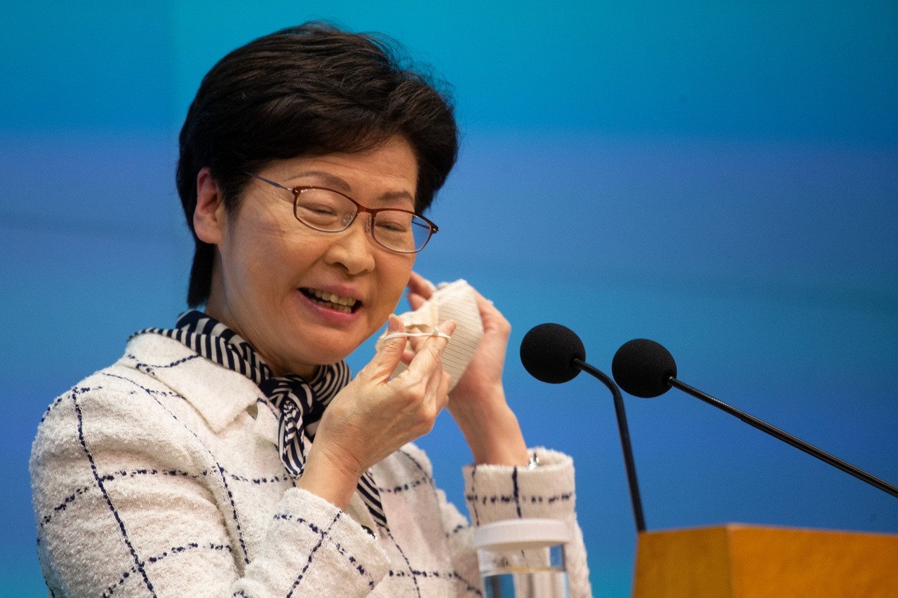 ▲香港特首林鄭月娥戴的「銅芯口罩」突然脫落,她試圖戴回去,後來乾脆直接摘掉。(圖/香港01授權提供,請勿隨意翻攝,以免侵權,下同)