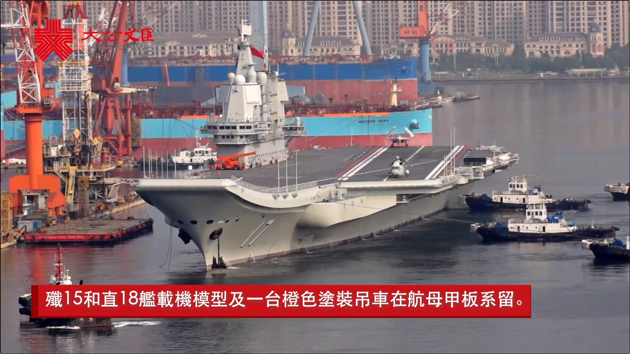 ▲9月1日上午,大陸首艘國產航母山東艦從大連造船廠啟航,赴渤海展開艦機融合訓練。(圖/翻攝自香港大公文匯全媒體視頻)