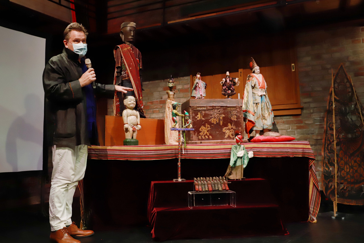 ▲「亞洲最完整收藏」萬件偶戲文物全數捐贈!偶戲專家羅斌博士介紹林經甫博士收藏的偶戲文物。(圖/文化部提供)