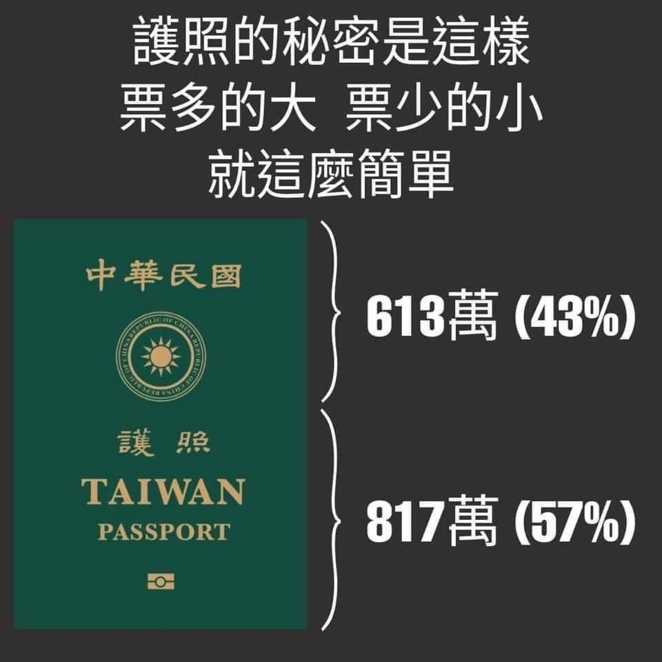 行政院2日公布新版護照封面,放大「TAIWAN」字樣,「Republic Of China」則改為環繞於國徽旁。對此,總統府副秘書長李俊俋引網友Kuso製圖,揭露其關鍵秘密,就是「票多的大,票少的小」。