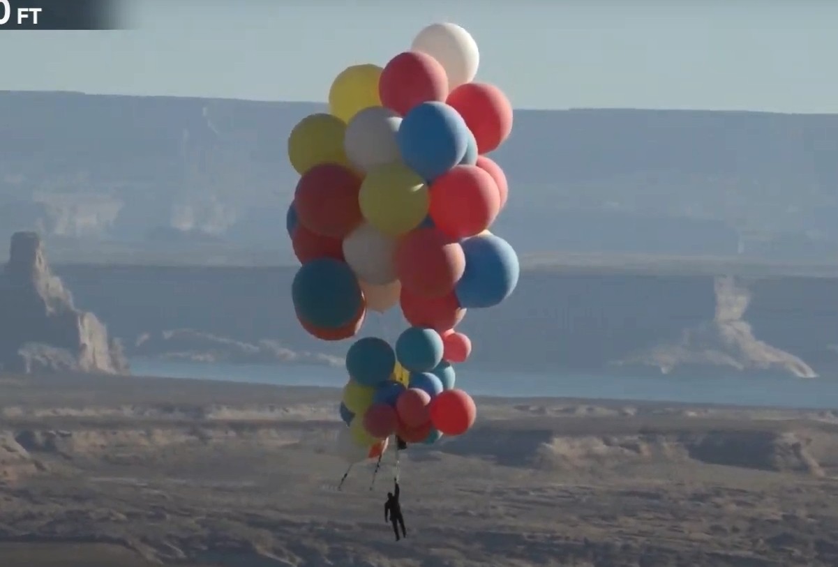 美國魔術師布萊恩(David Blaine)在當地時間2日上午,進行一項「手抓氣球」飄浮上高空的挑戰,並進行了3個小時的直播,根據畫面中顯示的數字,已經離地2萬4000英尺以上,也就是7400多公尺,所以在畫面中,他也必須使用氧氣瓶才能呼吸。