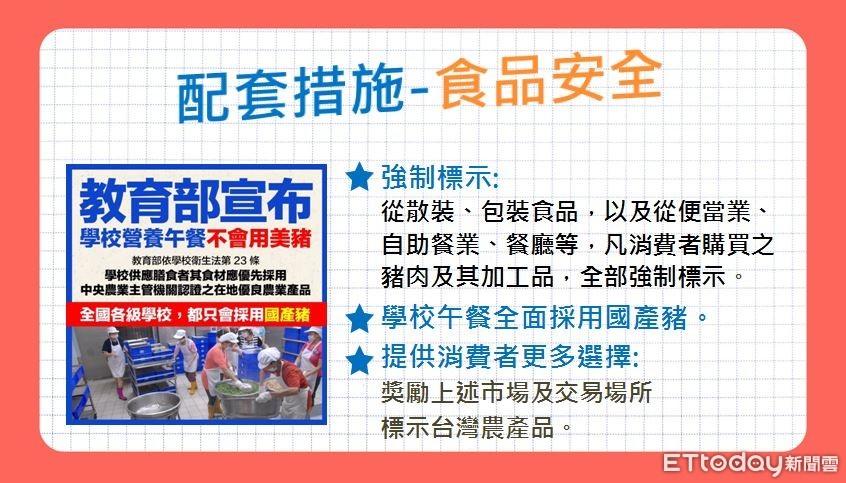 農委會公布相關三項配套措施,學校午餐全面採用「國產豬」;要求從散裝、包裝食品,以及從便當業、自助餐業、餐廳等,凡消費者購買之豬肉及其加工品,全部強制標示肉品來源、原料,110年1月1日生效;獎勵使用台灣農產品的餐飲業者。