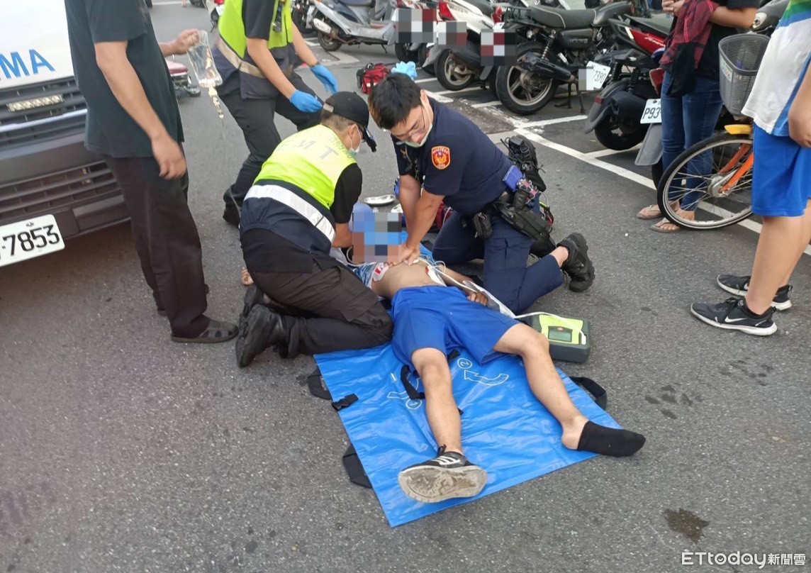 ▼救護人員鄒獻慶(左)、曾育佳(右)與員警蘇聖翔共同急救。(圖/記者陳豐德翻攝)