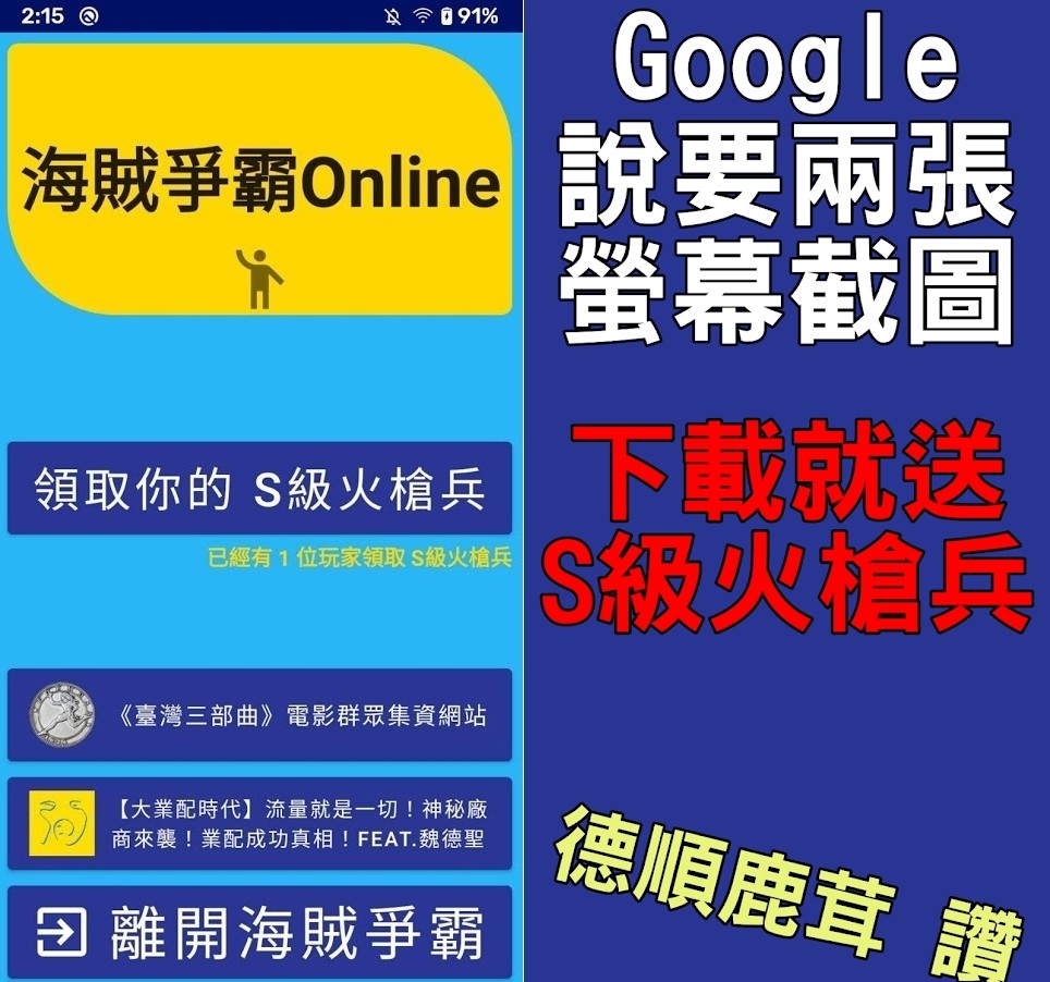 YouTube頻道「反正我很閒」近期與導演魏德聖合拍新影片,其中一個哏「海賊爭霸Online,下載就送S級火槍兵」引發熱議。原來是有網友看了影片後,特別製作一款「海賊爭霸Online 」遊戲App,瞬間吸引了許多粉絲朝聖,甚至有人留言「能在枯燥乏味的2020遇到這款遊戲,此生足矣。」