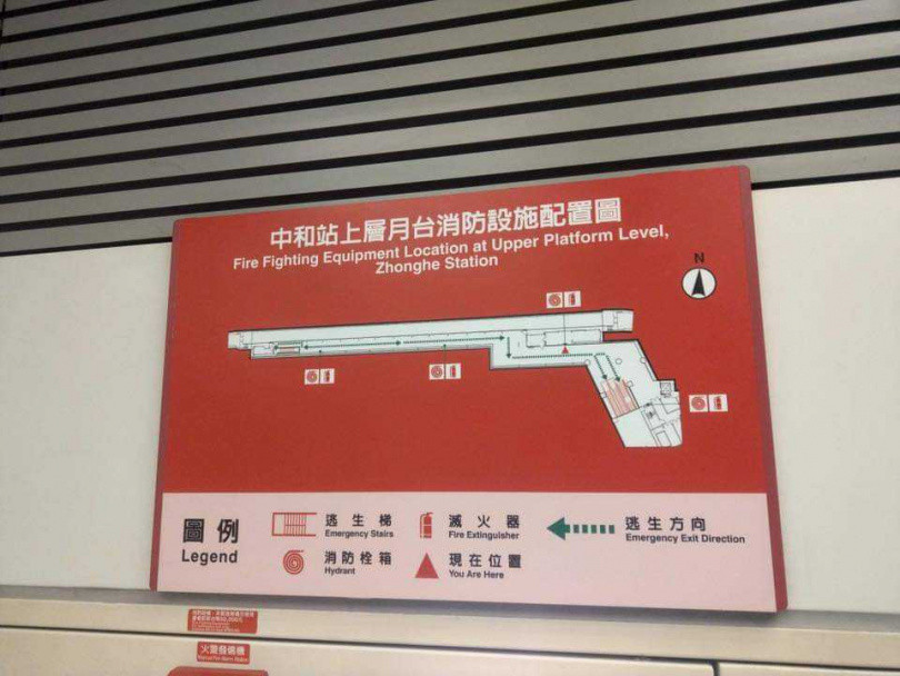 美國知名社群網站「reddit」上月底有網友上傳一張照片,發現該圖是新北市捷運中和站的「上層月台消防設施配置圖」,圖片上有逃生梯、消防栓箱、滅火器、逃生方向以及現在位置,提供民眾有需要時可藉此分辨相關安全與討生設施。