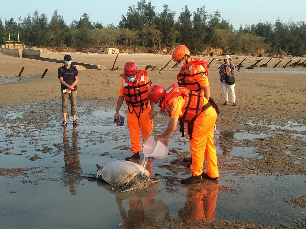 海巡署金馬澎分署第九岸巡隊第三機動巡邏站5日接獲民眾通報,在金門縣烈嶼鄉中墩岸際沙灘有一隻活體海龜,疑似迷途擱淺,隨即派遣線上巡邏同仁前往搶救,並同步通報金門縣政府水產試驗所到場援助,巡邏組人員抵達後立刻用濕布覆蓋擱淺海龜,由水試所人員初步檢驗無傷後,將綠蠵龜帶返留置、詳細檢查。