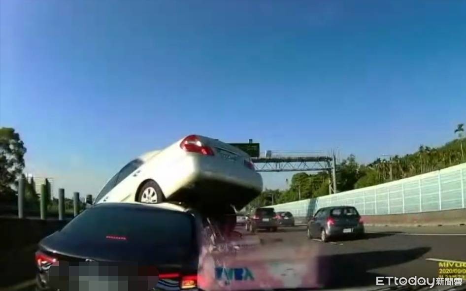 國道3號南投名間路段北上235K下午發生一起5車離奇追撞車禍!疑似駕駛應注意卻未注意前車狀況,未保持安全車距釀禍,其中一輛車尾被前車追撞頂起後,還撞到內側護欄騎上前車,不僅如此,後方追撞的自小客車擋風玻璃也碎裂,國道警方及高公局隨即加派緩撞車前往事故現場疏導。