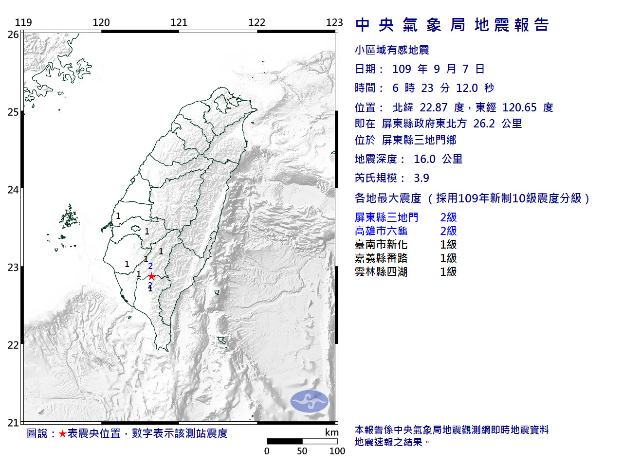 極淺層地震!根據中央氣象局的地震報告,7日6時23分發生芮氏規模3.9的有感地震,震央位於屏東縣三地門鄉,地震深度16公里,屏東縣、高雄市最大震度2級,台南市、嘉義縣、雲林縣震度1級。