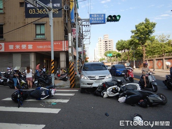 八德警分局交通分隊分隊長林芳宜表示,上午7時許,楊男駕駛汽車與劉女騎乘的機車在和平街與重慶街路口發生交通事故,楊男未依照程序下車處理,反而往交流道方向繼續直行,隨後在150米外的和平路與重慶街53巷口又追撞6輛機車後,導致機車騎士身體擦挫傷,楊男才停車。