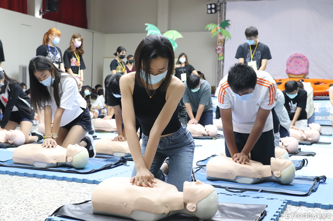 ▲中華醫大新生訓練推CPR和AED急救操作,學長姐以海邊溺水急救行動劇演出帶入情境,董事長鄭啟瑞(前右一)、校長曾信超(前左一)等人,和新生一起演練CPR。(圖/記者林悅翻攝,下同)