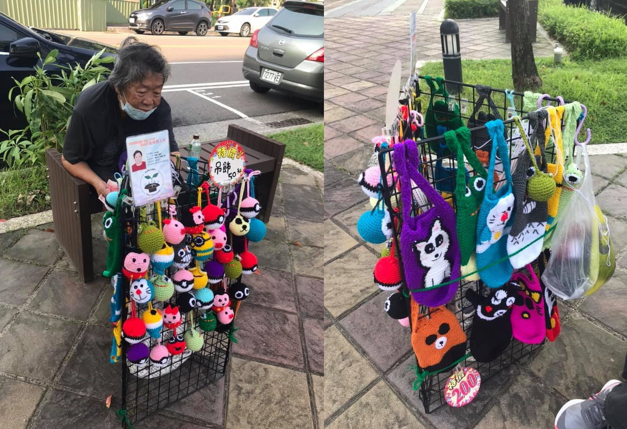 台南一名女網友發現,公園裡有一名白髮駝背的林阿嬤,縮在長椅上賣著許多可愛的杯套及飾品,且全部商品都是她一針一線手工製作,消息在網路上曝光後,引起大批熱心網友響應。對此,阿嬤表示,她也在桃園、高雄賣過,目前在台南自己一個人生活,賣多少算多少,有空來跟她捧場,她就心滿意足了。