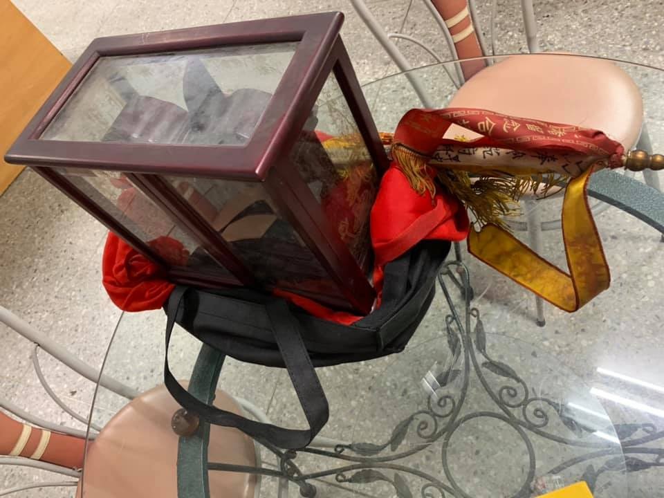 據了解,苑裡西平里一名林姓民眾日前出門,意外在家門口發現一個手提袋,打開一看,裡面竟然躺著一個木製玻璃櫃,裝有2座牌位,分別刻著孝思堂「張姓」「林姓」的祖先名。因為並非自家的東西,一發現就先暫時放置,直到傍晚都沒人來取回,便報警處理。